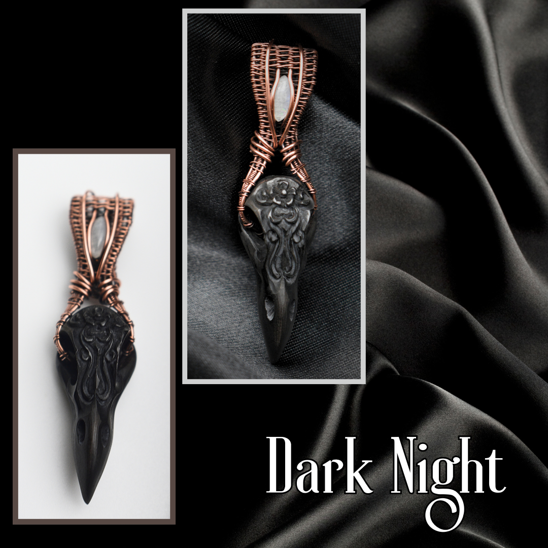 Crafted from ethically sourced buffalo bone, this Dark Knight pendant features an intricately carved raven's skull adorned with elegant swirly designs. Wrapped in oxidized copper and accented with a luminous moonstone, it rests gracefully on a 20-inch chain, combining artistry with natural beauty for a refined statement piece.